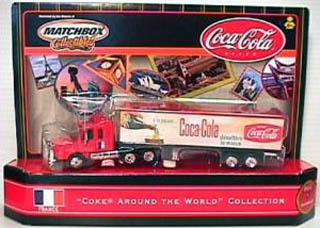 Red cab, red container, British flag, "At Home Too! Coca Cola"